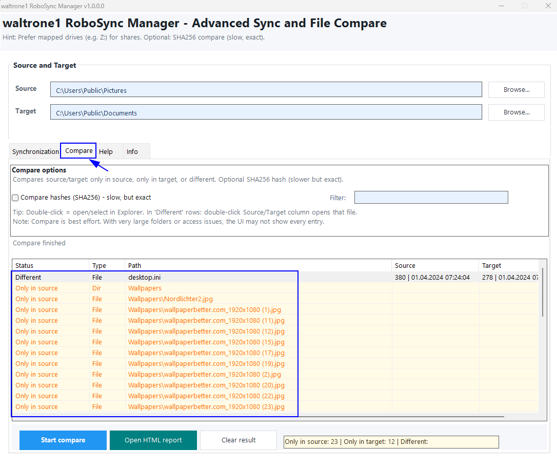 Neben der Synchronisation kann das Tool auch Verzeichnisse vergleichen. So erkennst du schnell, welche Dateien nur in der Quelle, nur im Ziel oder in unterschiedlicher Form vorliegen.